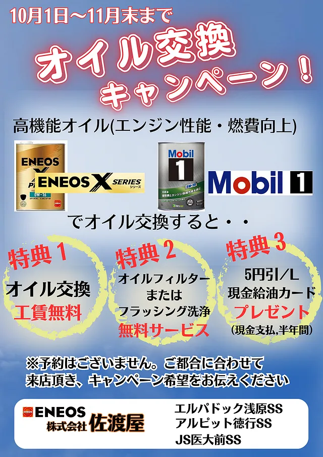 佐渡屋全店にて、毎年恒例のお得なオイル交換キャンペーンです