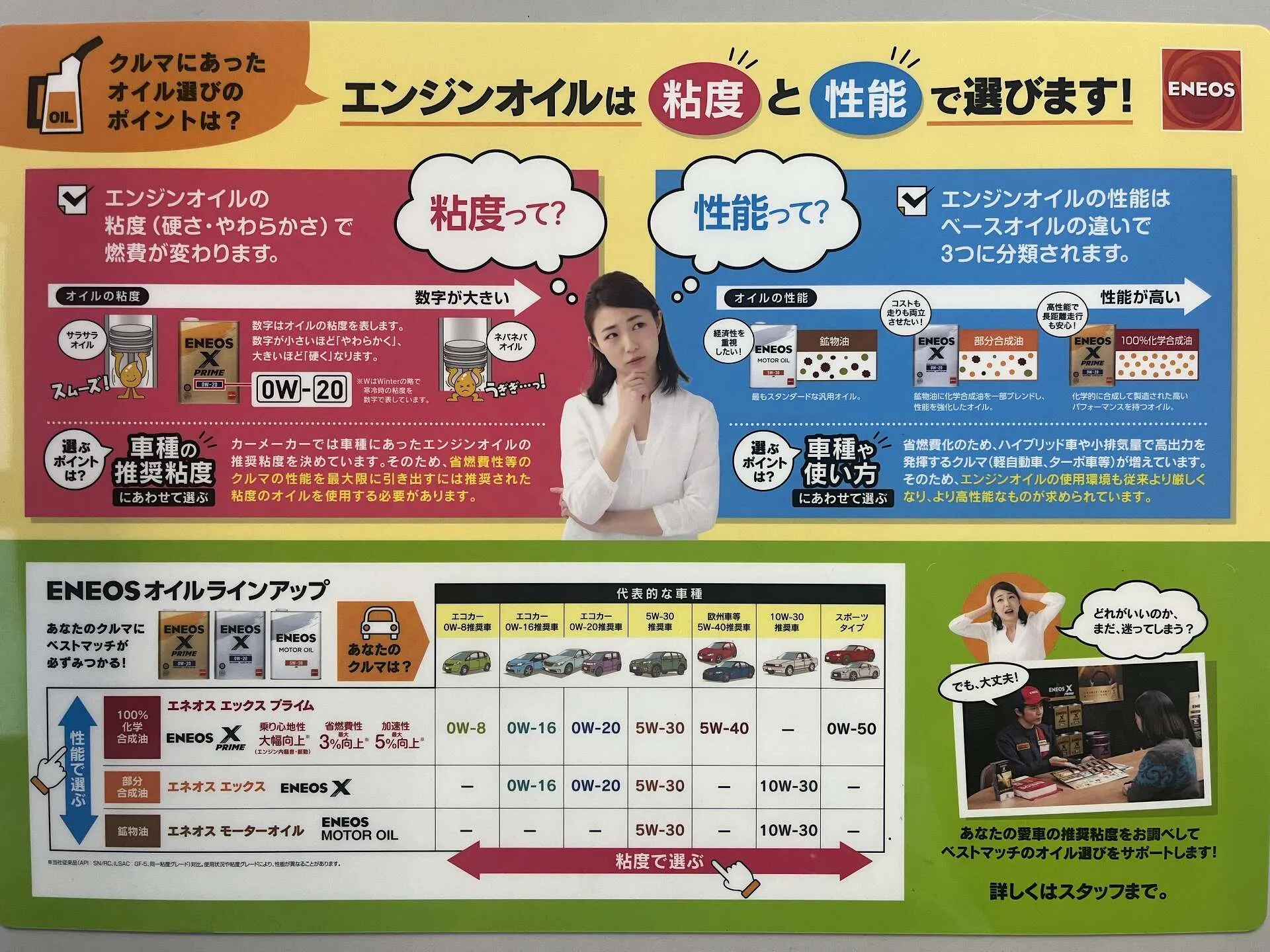 オイルは粘度と性能で選びます。車種によりメーカー指定の種類があります