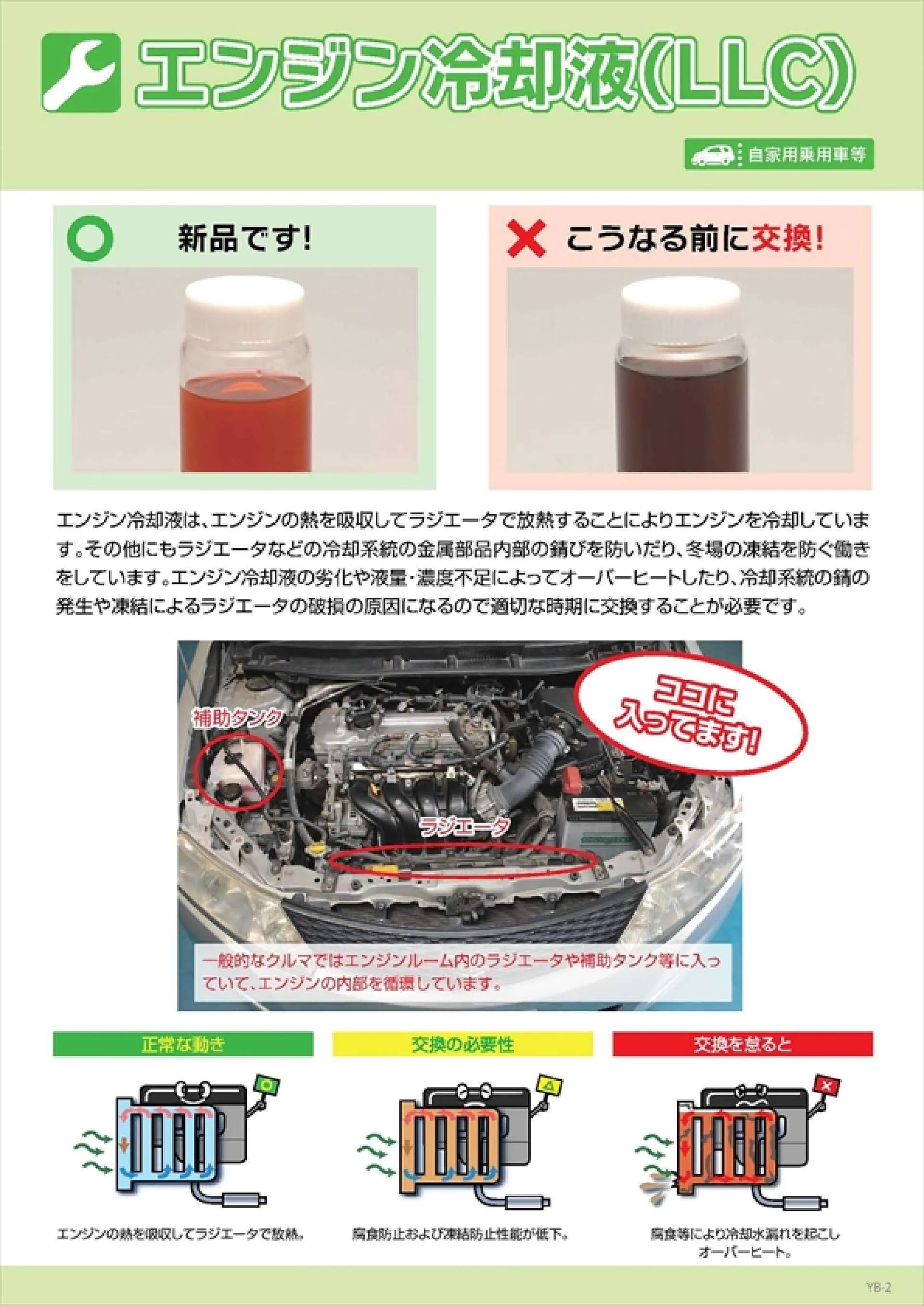 エンジン冷却液は、エンジンの熱を吸収してラジエータで放熱することによりエンジンを冷却していま す。 その他にもラジエータなどの冷却系統の金属部品内部の錆びを防いだり、冬場の凍結を防ぐ働き をしています。エンジン冷却液の劣化や液量・濃度不足によってオーバーヒートしたり、冷却系統の錆の 発生や凍結によるラジエータの破損の原因になるので適切な時期に交換することが必要です。