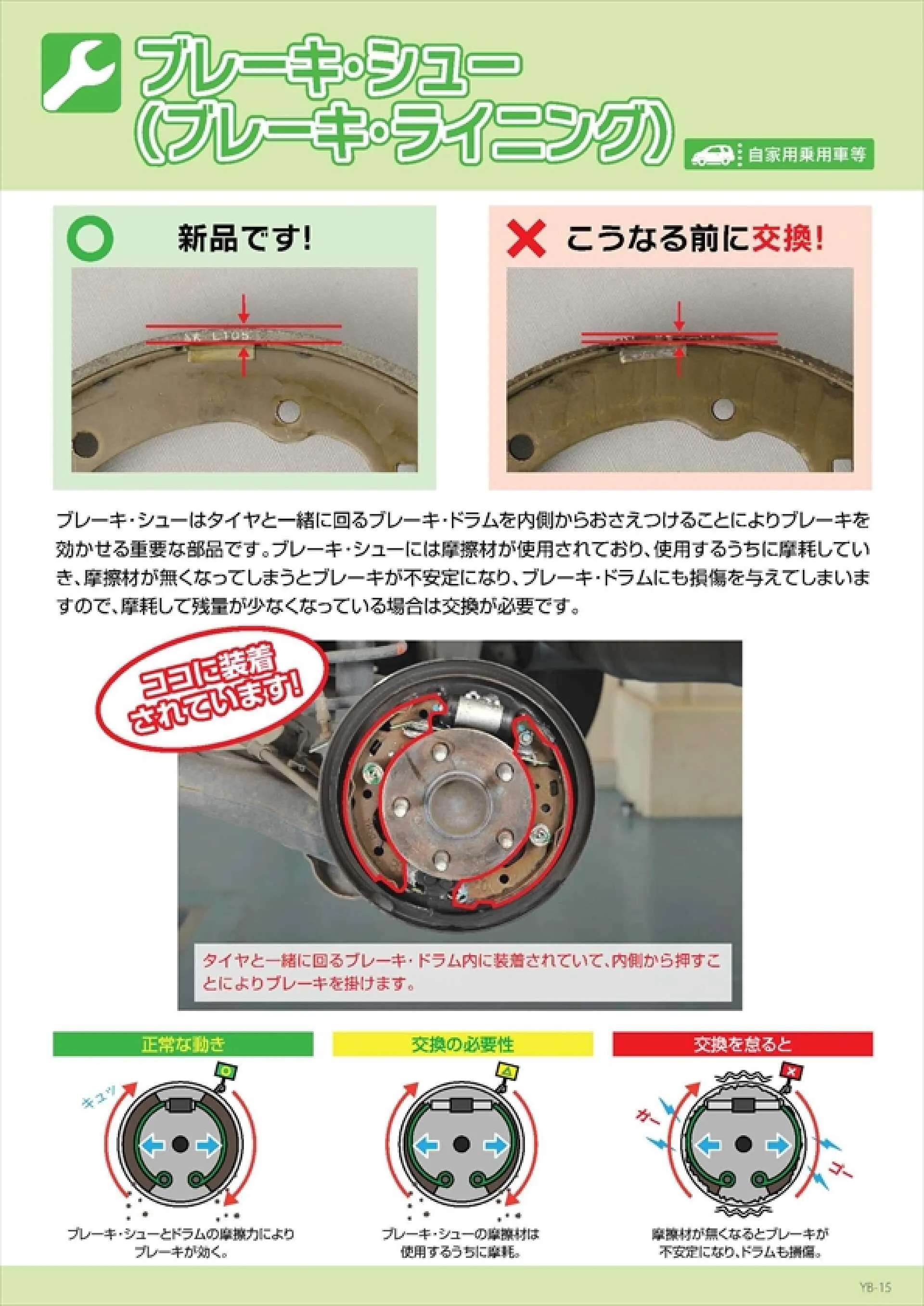 ブレーキシューはタイヤと一緒に回るブレーキ・ドラムを内側からおさえつけることによりブレーキを 効かせる重要な部品です。 ブレーキシューには摩擦材が使用されており、 使用するうちに摩耗してい き、摩擦材が無くなってしまうとブレーキが不安定になり、 ブレーキ・ドラムにも損傷を与えてしまいま すので、摩耗して残量が少なくなっている場合は交換が必要です。