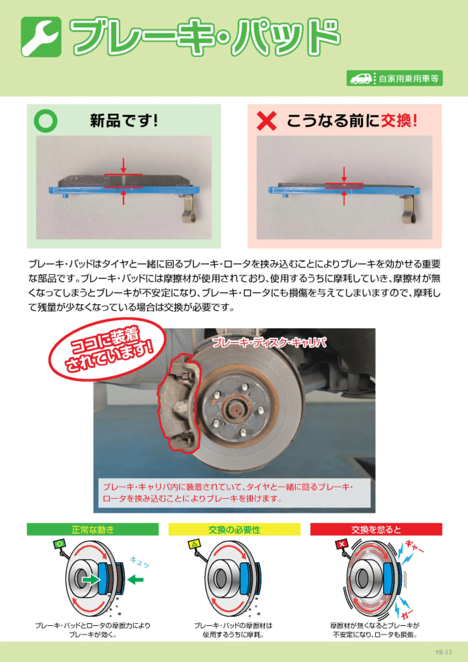 ブレーキ・パッドはタイヤと一緒に回るブレーキ・ロータを挟み込むことによりブレーキを効かせる重要 な部品です。 ブレーキ・バッドには摩擦材が使用されており、使用するうちに摩耗していき、摩擦材が無 くなってしまうとブレーキが不安定になり、 ブレーキ・ロータにも損傷を与えてしまいますので、摩耗し て残量が少なくなっている場合は交換が必要です。