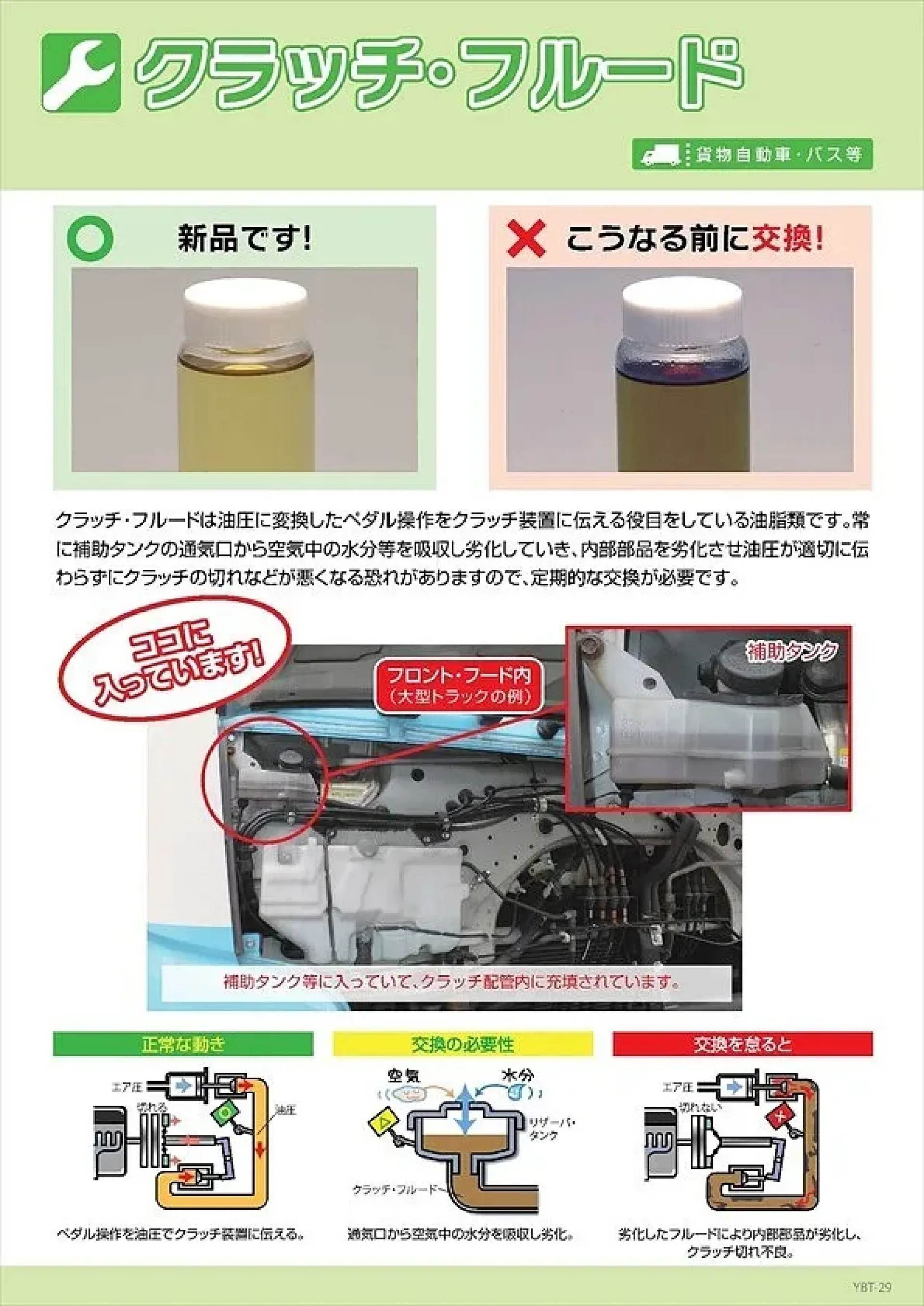 クラッチ・フルードは油圧に変換したペダル操作をクラッチ装置に伝える役目をしている油脂類です。常 に補助タンクの通気口から空気中の水分等を吸収し劣化していき、 内部部品を劣化させ油圧が適切に伝 わらずにクラッチの切れなどが悪くなる恐れがありますので、定期的な交換が必要です