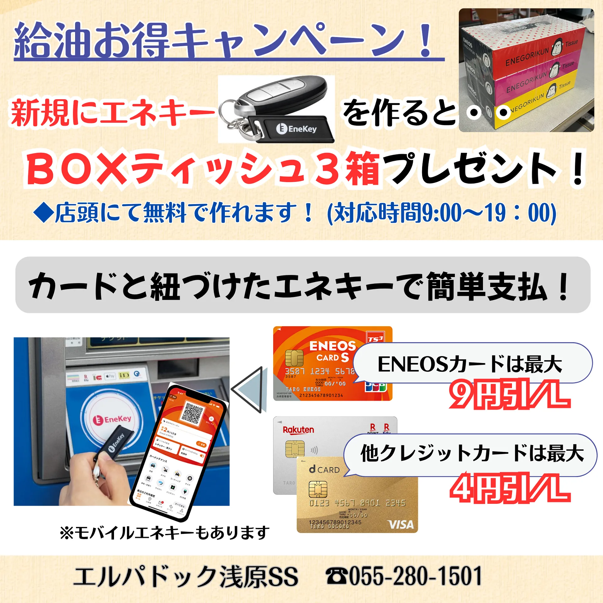 新規にエネキーを作成すると、「BOXティッシュ3箱」プレゼント!ENEOSカードと紐づけは、最大9円引き/L他社のカードと紐づけは、最大4円引き/Lエネキー説明サイトモバイルエネキーもあります詳しくはこちらから