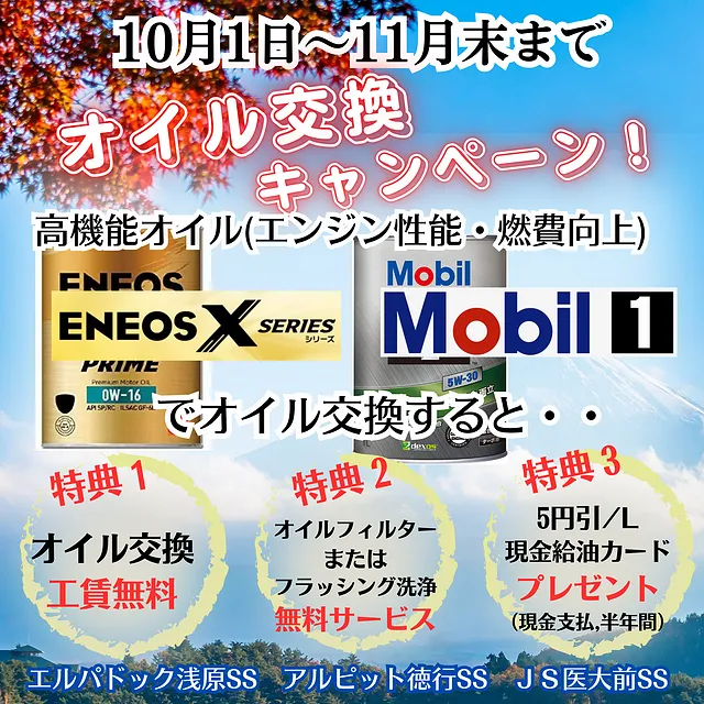 ENEOSXまたはMobil1にて交換すると、お得な3大特典が受けられます。ぜひこの機会に、交換をお勧め致します。
